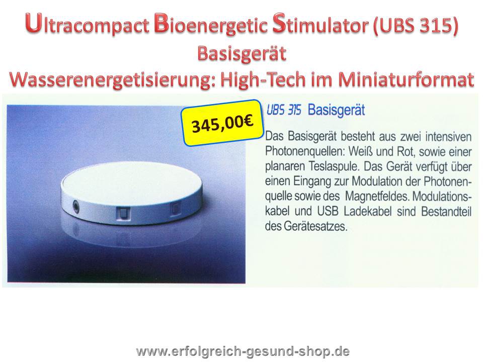 Das UBS 315 dient vorrangig der Wasserenergetisierung und der energetischen Stimulation von wasserhaltigen Substanzen. Das UBS 315 (Ultracompact Bioenergetic Stimulator) verfügt über eine Photonenquelle und ein pulsierendes Magnetfeld. Das Magnetfeld wird mit einer planaren Teslaspule erzeugt. Somit ist ein erheblicher Teil des Magnetfeldes ein besonders wirksames Scalarfeld. Es pulsiert mit der biologisch besonders wirksamen Globalfrequenz (7,8 Hz).